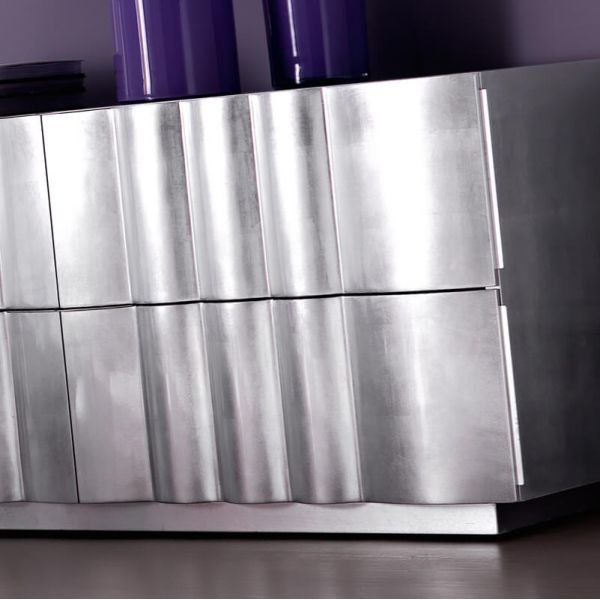 Shown here in a luxurious silver leaf finish to to the drawers and baseboard as part of a bedroom set but also suitable as a sideboard.