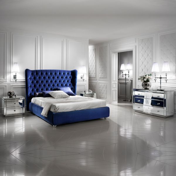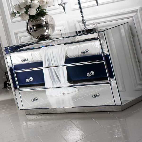 A 3 drawer chest with crystal handles sitting on a polished stainless plinth base.