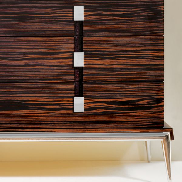 Shown here finished in a dark high gloss ebony wood veneer with polished stainless steel legs and six drawers with a soft closing system.