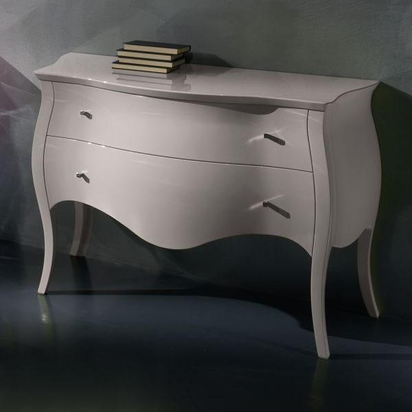 Finished in a high gloss taupe lacquered finish.