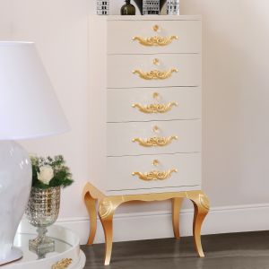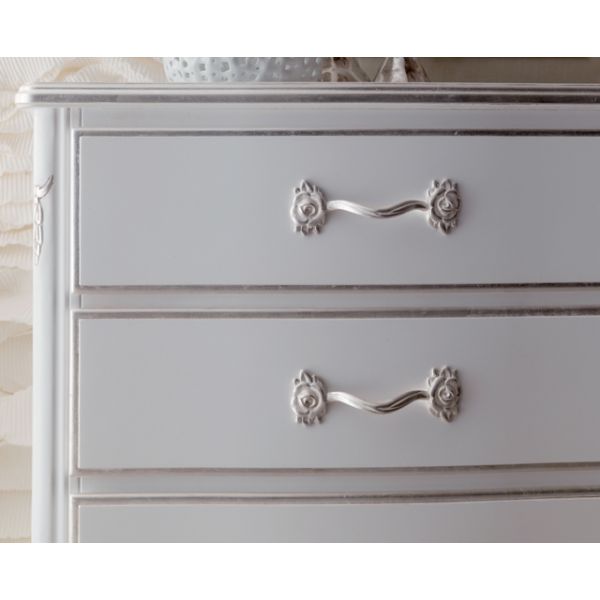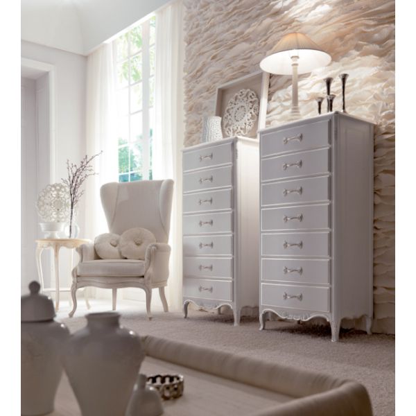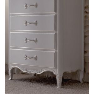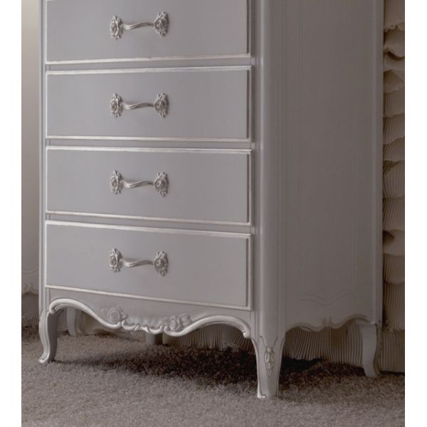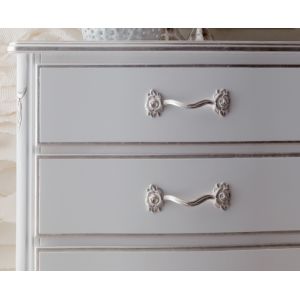 Luxurious Italian 7 drawer tall boy chest finished in French grey with silver edge detailing and handles.