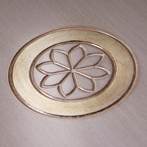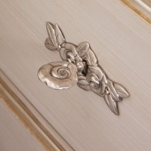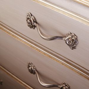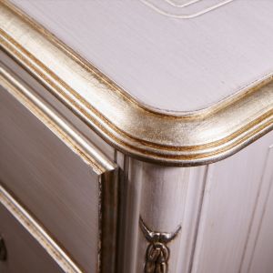 Shown here in an antique white with hand painted gold leaf elaborate detailing and a wooden top.