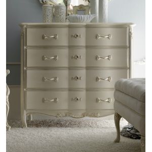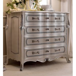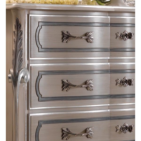 Shown here in finished by artisans in a luxurous painted silver, grey and blue with a wooden top.