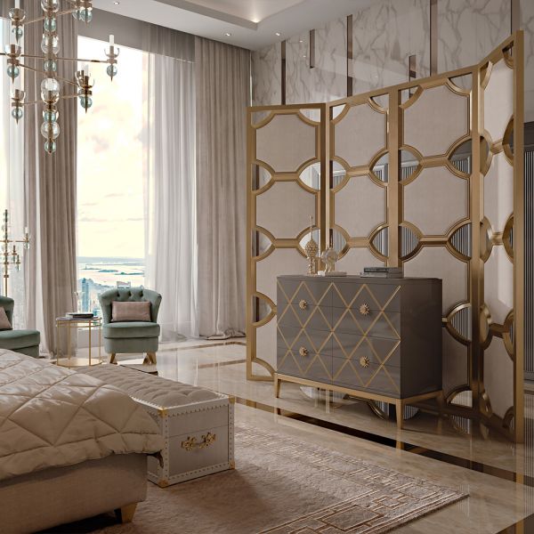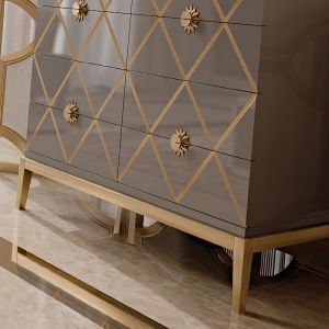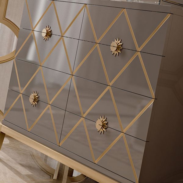 A high gloss warm grey lacquered structure with 8 antique gold leaf detailed diamond drawers, featuring statement sunburst feature handles in an antiqued gold finish.