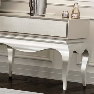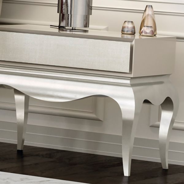 Finished in a smooth cream lacquer together with a linen upholstered drawer front creating a charmingly chic design.