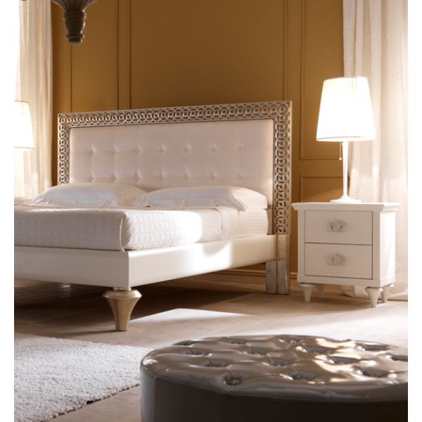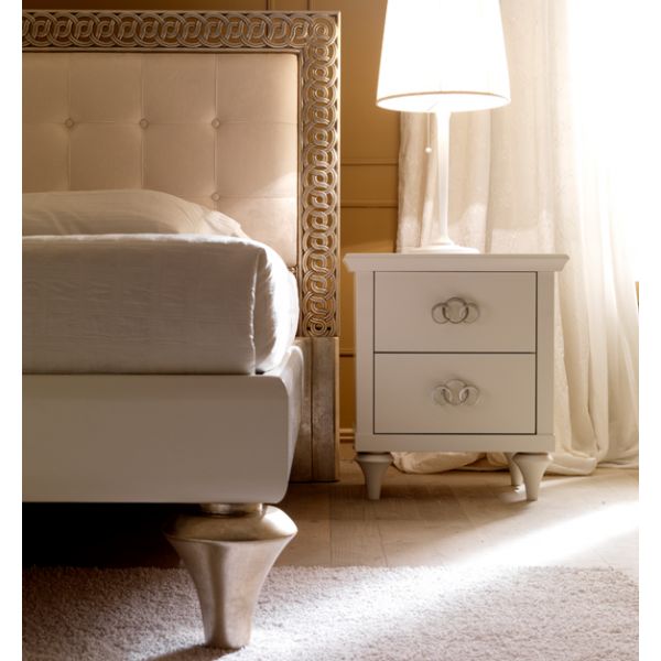 The bedside table is shown here in our white lacquered finish with intricate wrought iron handles finished in silver leaf.