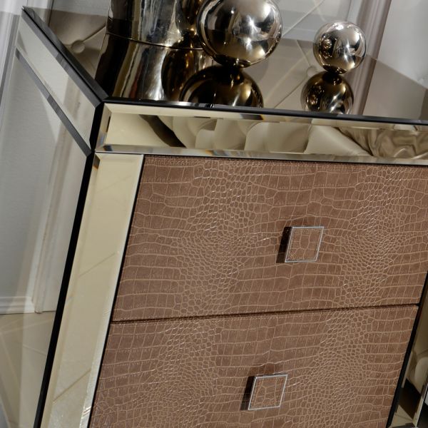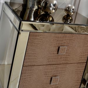 Shown here in the finest venetian bronze 4 mm bevelled mirrored finish together with the two drawers in a luxurious alligator pattern embossed leather with matching square chrome handles enhanced by defined detailed stitching.