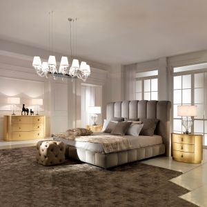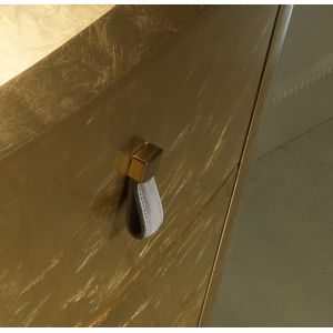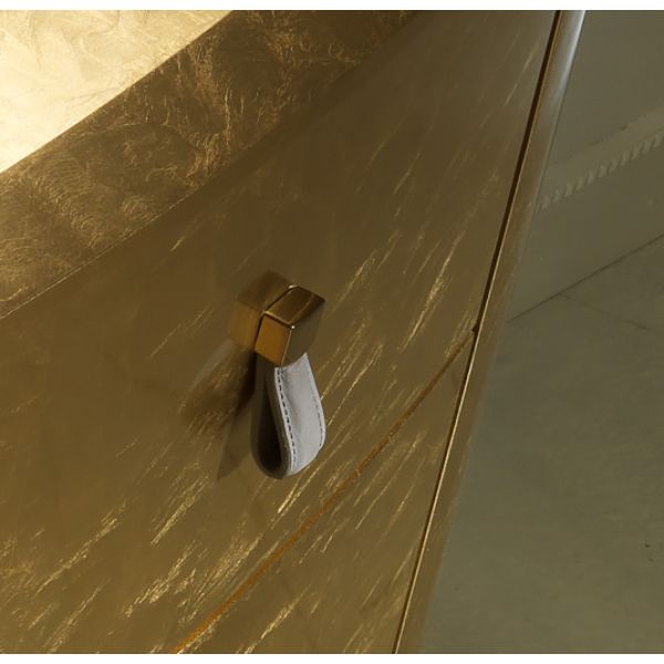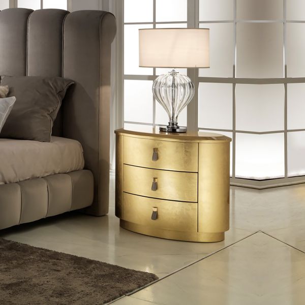 Luxury Italian Oval Gold Bedside Chest. This luxurious three drawer bedside cabinet is made by master Italian furniture makers and has an integrated soft close bluemotion system for effortless closing. Its beautifully curved shape and gold leaf finish off