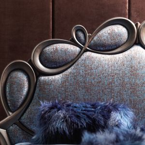 The Rustic Effect Looped Designer Bed is an eye catching addition to any bedroom. Shown here with a brown rustic painted finish to the headboard and legs, headboard upholstered in a high quality unique two-tone padded fabric and the base upholstered in a