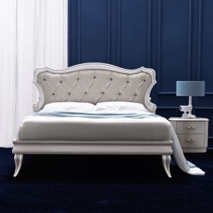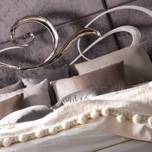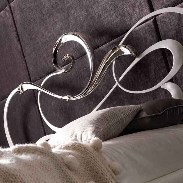 The Pearl and Silver Designer Italian Iron Bed is a beautiful addition to any bedroom. Shown here with a silver and pearl painted finish to the elaborate large swirls of the statement headboard. Bed base shown here in a luxurious soft white Italian