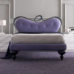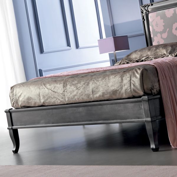 Pewter Upholstered Bed. This seductive bed uses sumptuous finishes and textures to make a luxurious statement. This unique design features a fabulous pewter and dusky pink upholstered headboard. The headboard is available finished in a variety of fabrics,