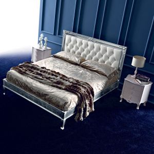 Leather Button Upholstered Silver Leaf Bed. This seductive bed uses sumptuous finishes and textures to make a luxurious statement. This unique design features a fabulous silver leaf finished frame and a soft white Italian leather button upholstered headbo