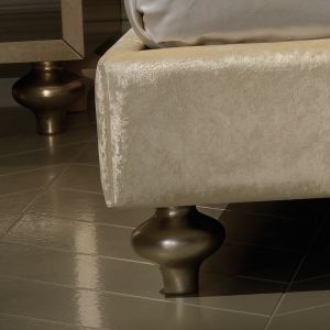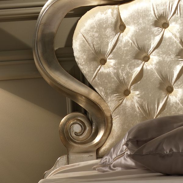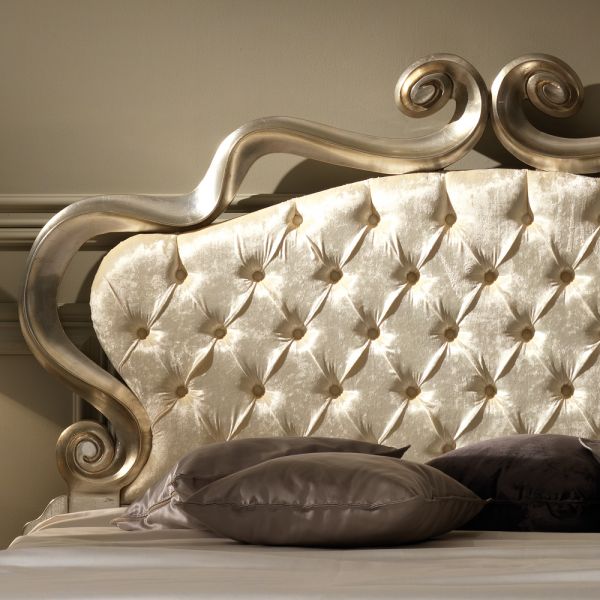 Modern Italian Designer Champagne Leaf Bed. The solid wood headboard is the primary focus to this fabulous design. Made from solid wood it is beautifully curved and scrolled creating a remarkable feature, finished in champagne silver leaf along with turne