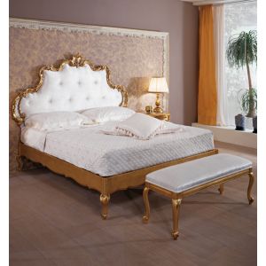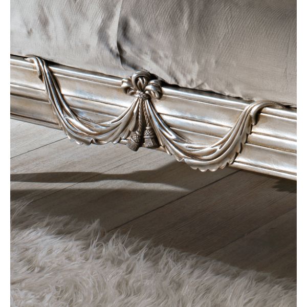 French luxurious ornate champagne silver leaf bed made to the highest standards from solid carved wood. Shown here in our champagne silver leaf with an antique finish. Available to order in various colours as standard. Fabric as shown but also available w