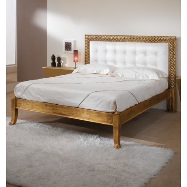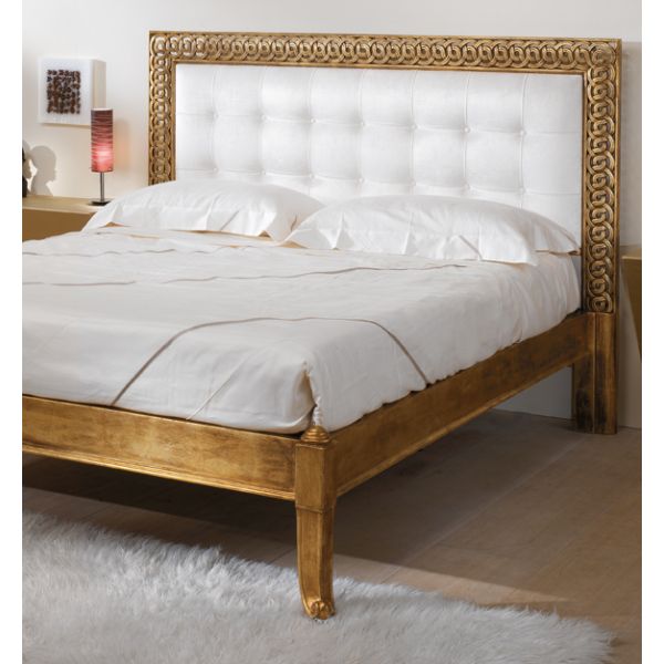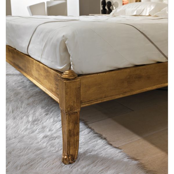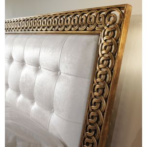 French luxurious carved gold bed made to the highest standards from solid carved wood. Shown here in our gold leaf with an antique finish. Available to order in various colours as standard. Fabric as shown but also available with customers own fabric, lea