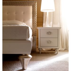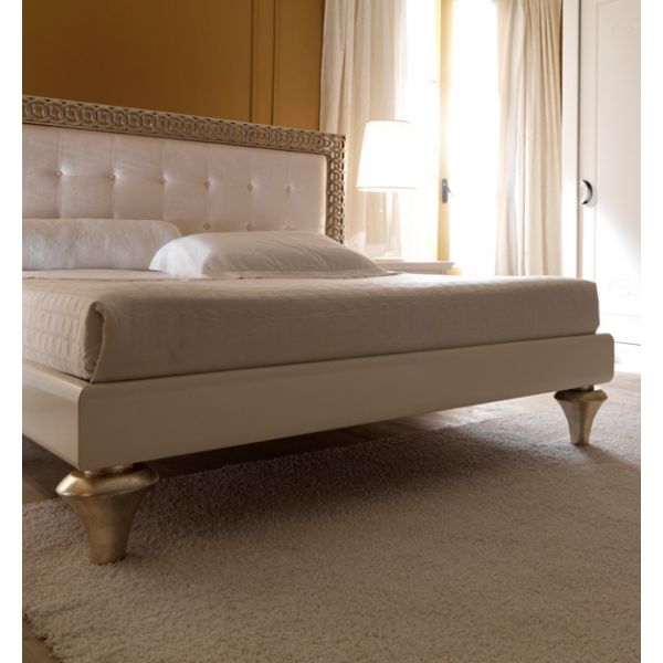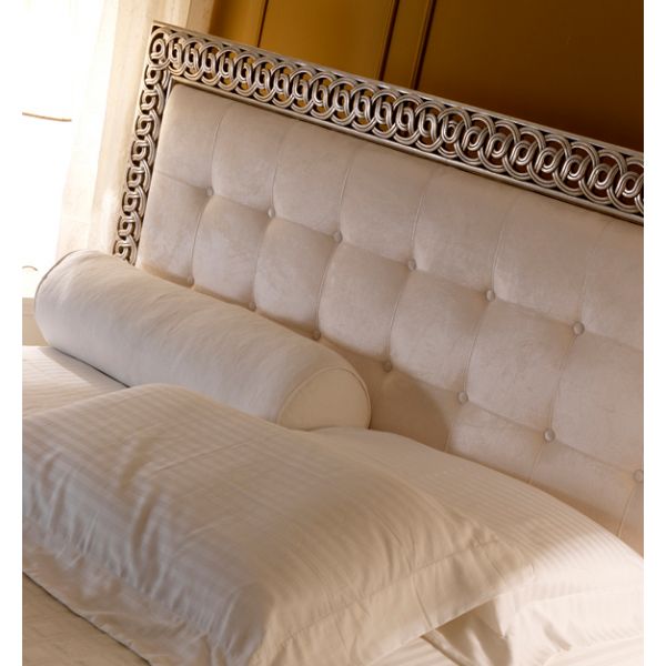 French luxurious carved silver bed made to the highest standards from solid carved wood. Shown here in our silver leaf with an antique finish to frame and legs. Available to order in various colours as standard. Button upholstered fabric headboard as show
