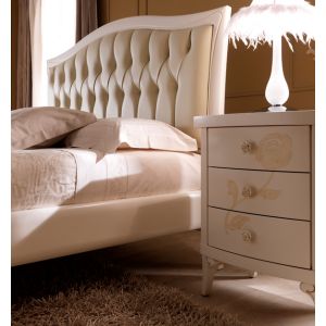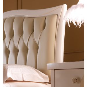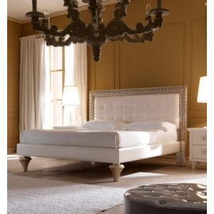 French luxurious white lacquered bed made to the highest standards from solid carved wood. Shown here in our pearl white lacquered finish to frame. Available to order in various colours as standard. Ivory leather headboard button upholstery as shown but a