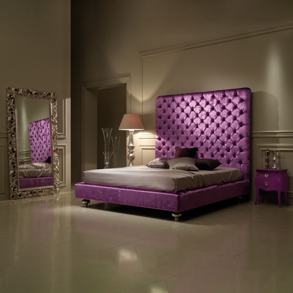Exclusive Italian Purple Crushed Velvet Upholstered Bed. This sumptuously seductive bed will add a glamorous focus to any contemporary bedroom interior offering superb comfort and style. Shown here made of solid wood, and beautifully button upholstered wi