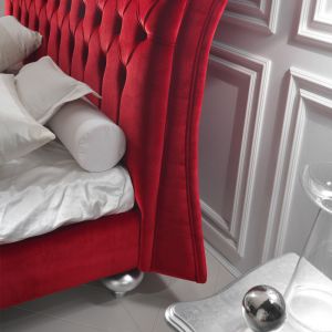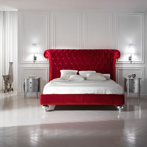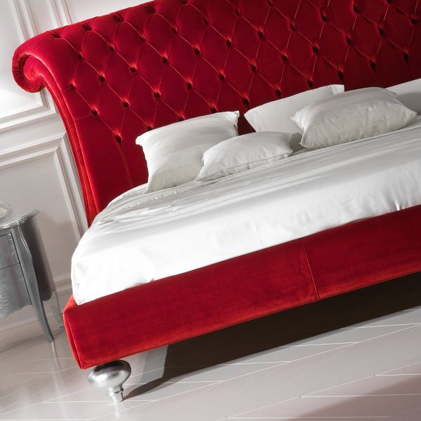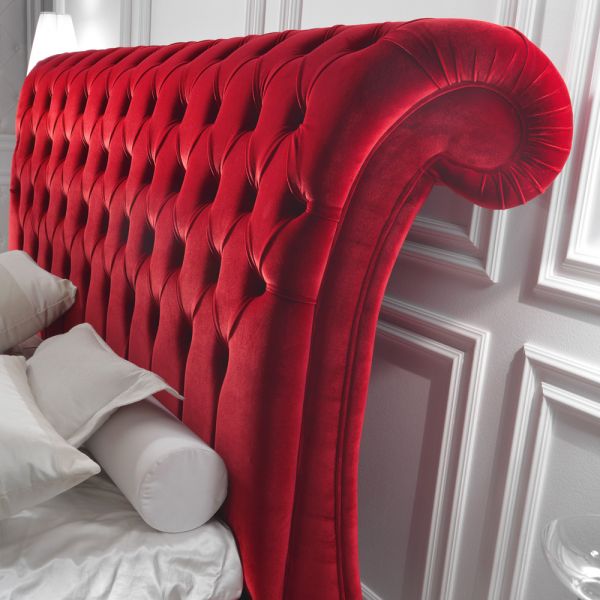 The Luxurious Velvet Button Upholstered Italian Designer Bed, with the romantic curves of its statement tall headboard being the primary focus to this fabulous design. Creating a remarkable feature.