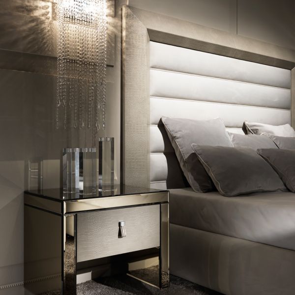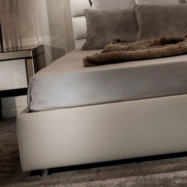 The Contemporary Alligator Embossed Pattern Leather Italian Bed is a striking contemporary addition to any bedroom. Made by the finest Italian furniture makers. The statement clean lines of the headboard detail provide a grand addition to any interior des