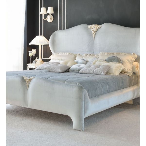 Luxurious Italian Designer Upholstered Bed. Shown here in a luxurious powder blue upholstery with antique ivory painted detail to the headboard and foot of the bed