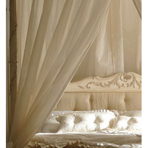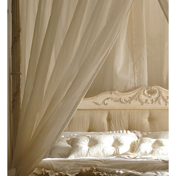 High End Four Poster Button Upholstered Italian Bed. Shown here in a distressed hand painted ivory frame, button upholstered with a high quality ivory linen and matching sheer curtains.