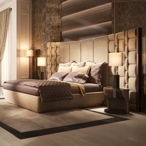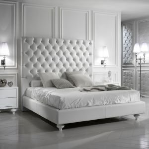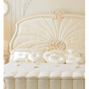 Extravagant Italian Designer Oyster Upholstered Bed finished by artisans in a luxurious painted ivory and bleached gold detailed frame and ruffle upholstered with a high quality ivory satin