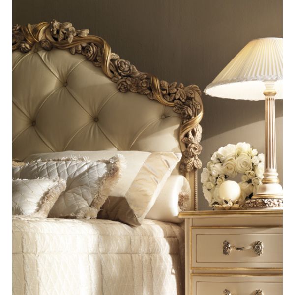 High End Italian Rose and Ribbon Button Upholstered Bed. Shown here hand painted in a rich sepia and pure gold frame, button upholstered with a high quality ivory leather.