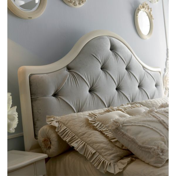 Classic Italian Designer Button Upholstered Bed. Shown here in a luxurious ivory painted frame and button upholstered with a high quality pale grey velvet.