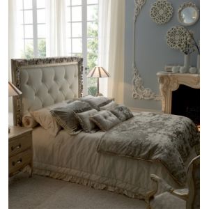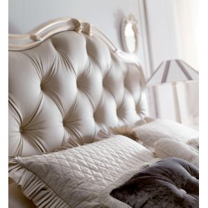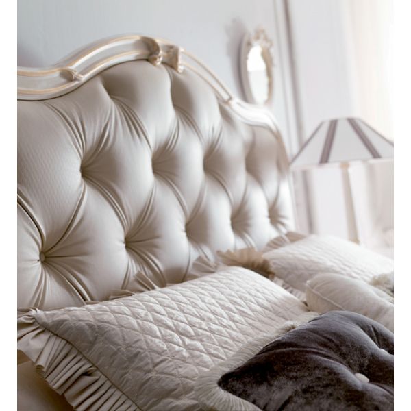 High End Italian Button Upholstered Bed. Finished by artisans with a luxurious painted frame shown in an antiqued ivory with bleached gold handpainted detail and button upholstered with a high quality ivory leather