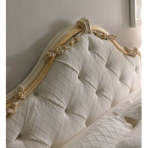 Italian Rose Detail Luxury Bed finished by artisans with a luxurious painted frame shown in an antiqued ivory with bleached gold hand painted detail and button upholstered with a high quality linen on the headboard and base