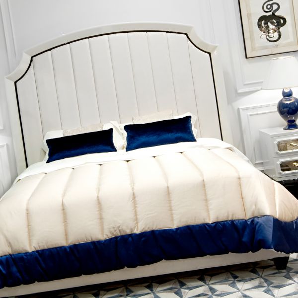 High End Modern White Ottoman Storage Bed. This unusual Italian design has a chic headboard with a white high gloss finished edge to the frame together with a striking black outline. Features super soft white velvet upholstered panels as shown or in a fab