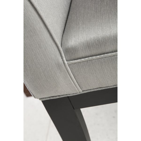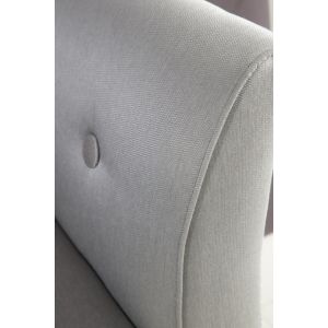 Grey Upholstered Designer Window Seat. This modern window seat provides a charming addition. Shown here in luxury grey fabric with simply detailed with 2 central buttons inside each end arm. A beautiful focus in any room of the house, adding style and sop