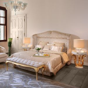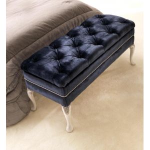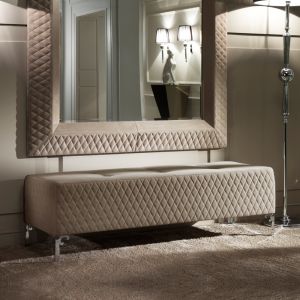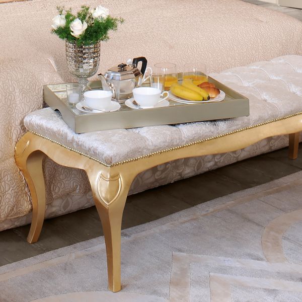 High End Classic Italian Upholstered Gold Bench. This elegant design features simple curved lines together with beautiful buttoned upholstery. Curved legs are finished with gold leaf.