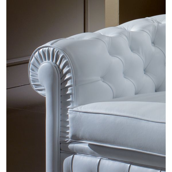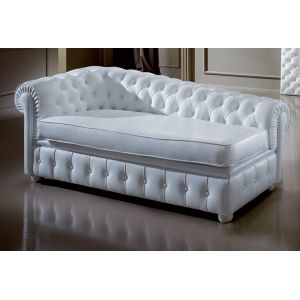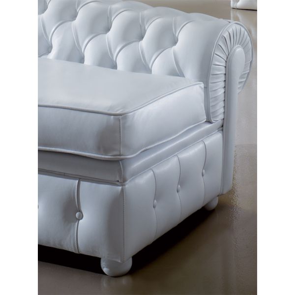 Shown here upholstered in white leather with a button finish.
