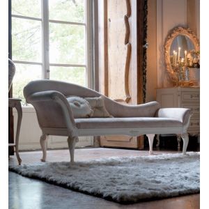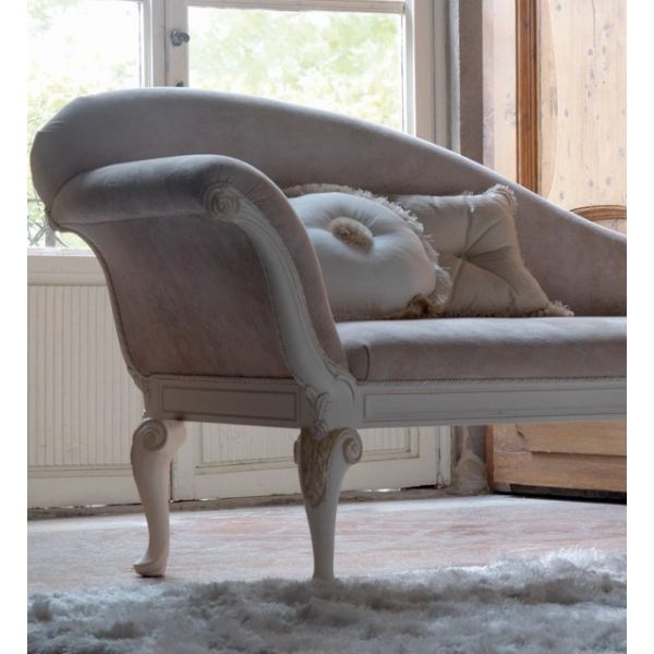 The Reproduction Designer High Back Italian Chaise Longue is shown here upholstered in a beautiful ivory velvet with an ivory and hand painted bleached gold finished frame.