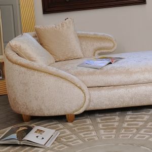 Sumptuously padded and upholstered with a luxury grey fabric and detailed with gold studs for a contemporary edge.