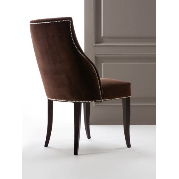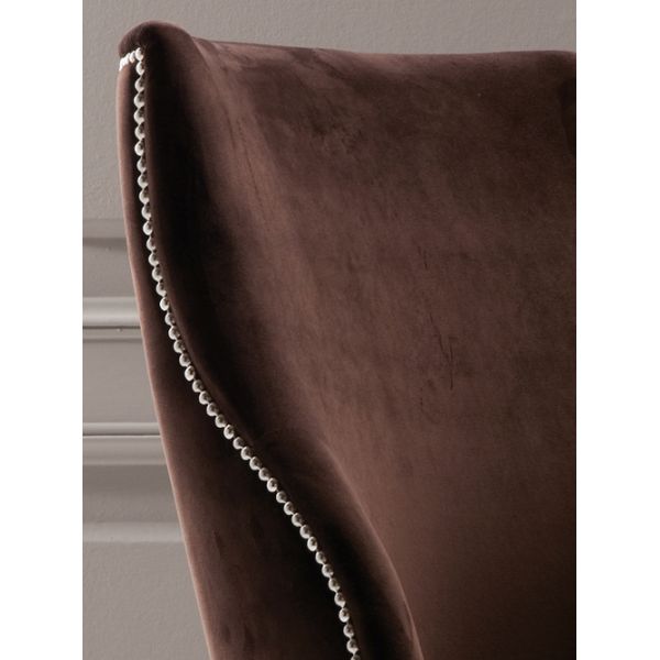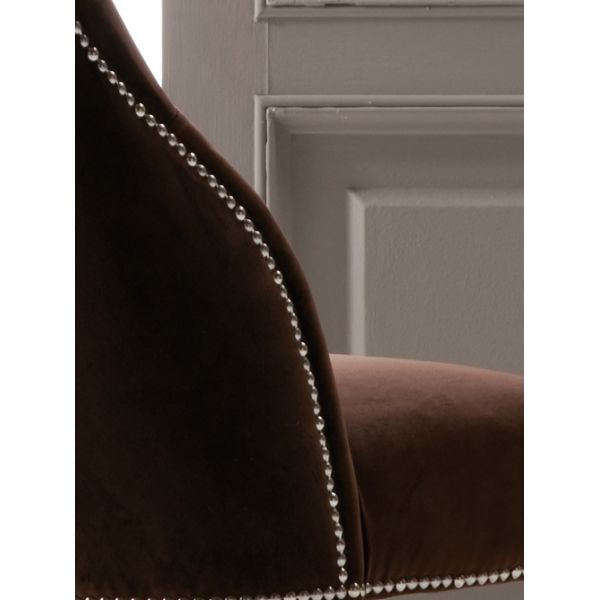 World class luxurious studded velvet chair shown here in our dark chocolate velvet with intricate stud detail and a high gloss or matt lacquered frame but available to order in various fabrics and frame colours and with customers own fabric.