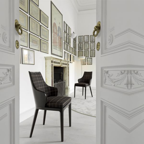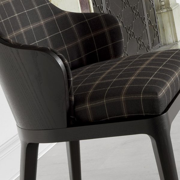 Stylish High End Upholstered Italian Chair. Clean crisp lines of this stylish chair sets this design apart. Made of solid black Ash wood and beautifully upholstered in a modern luxury brown checked fabric. The seat cushion is made from differential-densit