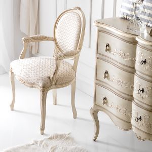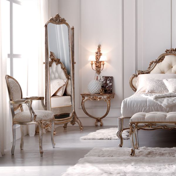 The Luxurious Rococo Upholstered Antiqued Armchair?is a statement chair for any room in the house. Stunning in any setting. Shown here in an antiqued silver finish together with accents of gold and champagne with matching piping to complement the beautifu