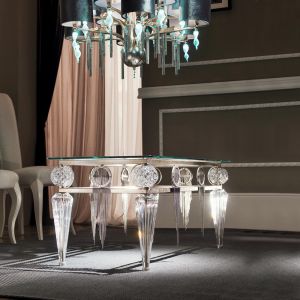 This sensational table exudes glamour in the utmost, creating the perfect accessory for your luxury home. The metal frame is finished in silver-leaf with a smoked glass slightly oval top. But it is the remarkable legs and unique decoration that really mak
