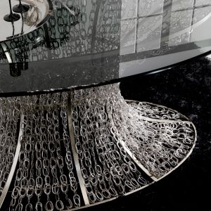 Oval Silver Leaf Smoked Glass Dining Table. This sensational Italian table exudes glamour in the utmost creating a perfectly unique dining table for your luxury home. A veil of silver-leafed chains cloak the metal pedestal base for a fabulously dynamic ef
