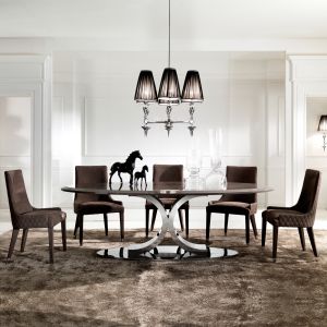 A stainless steel statement base with a stunning bevelled high gloss RAL lacquered oval table top.