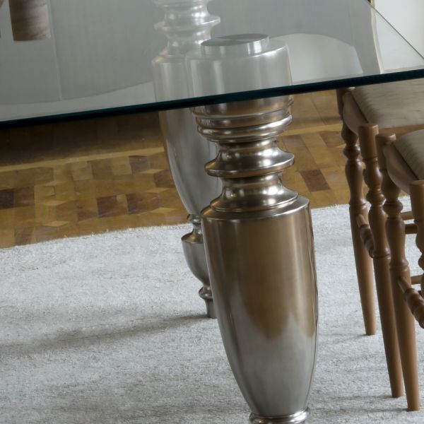 Shown here with a 12 mm thick transparent extra-light tempered glass top, which can also be produced with a matt or gloss lacquered finish. The glass top is placed directly on solid magnolia turned legs with a smooth chrome effect finish. Legs can be manu