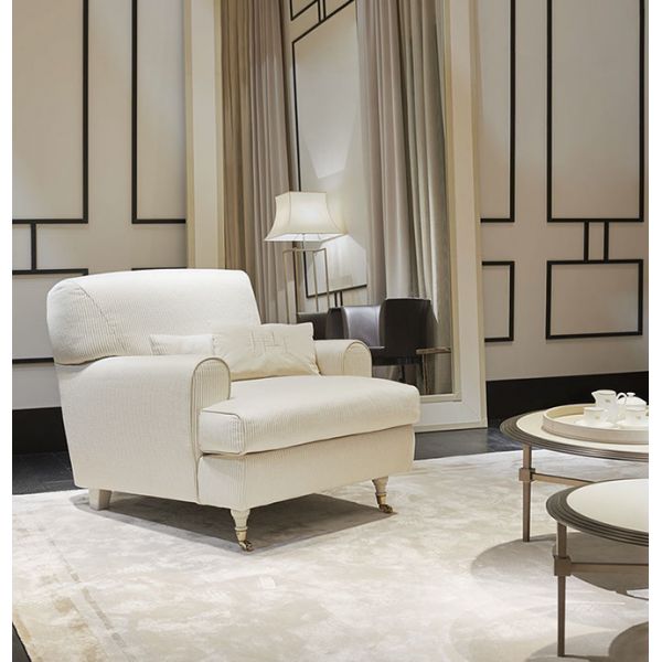 The leather or fabric upholstery comes in delicate tones of ivory, ecru and beige. The foot is embellished with a discreet little brass wheel.