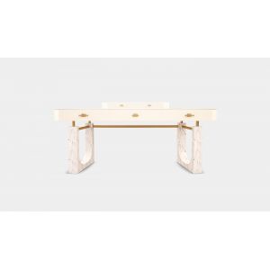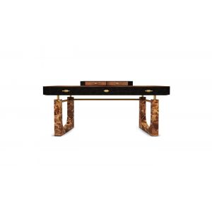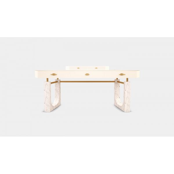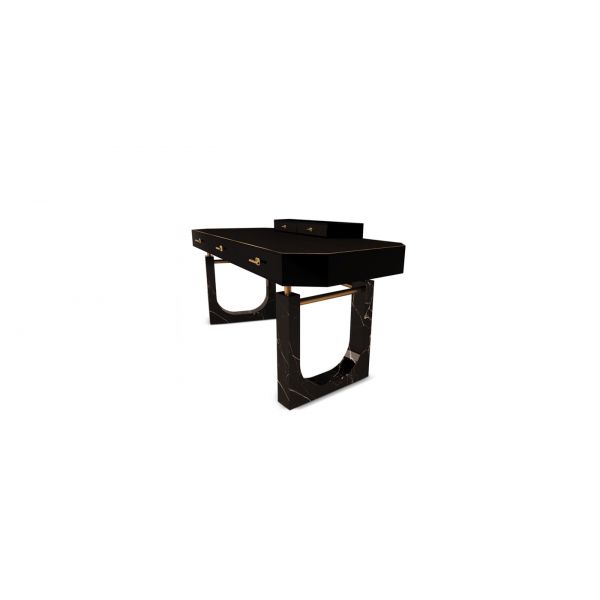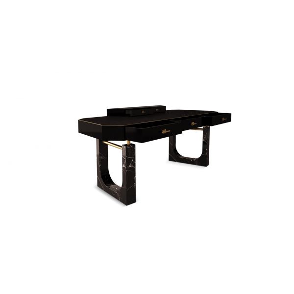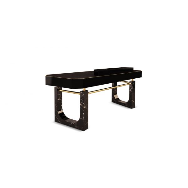 Top: Genuine leather , lacquered wood with high gloss varnish Structure: Negro Marquina marble , brushed brass Details: Brushed brass