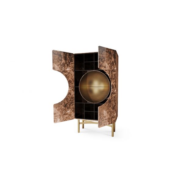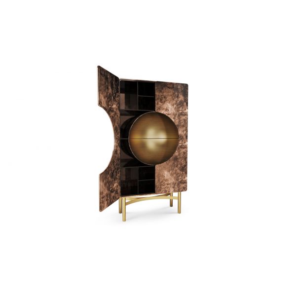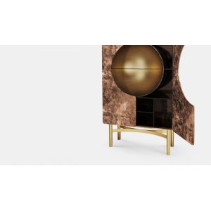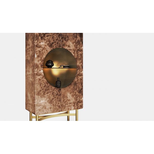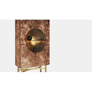 Structure: Myrtle burl with high gloss varnish, Aged brushed brass, Smoked glass shelve Legs: Brushed brass Interior: Lacquered wood with high gloss varnish