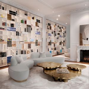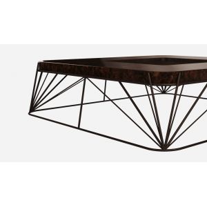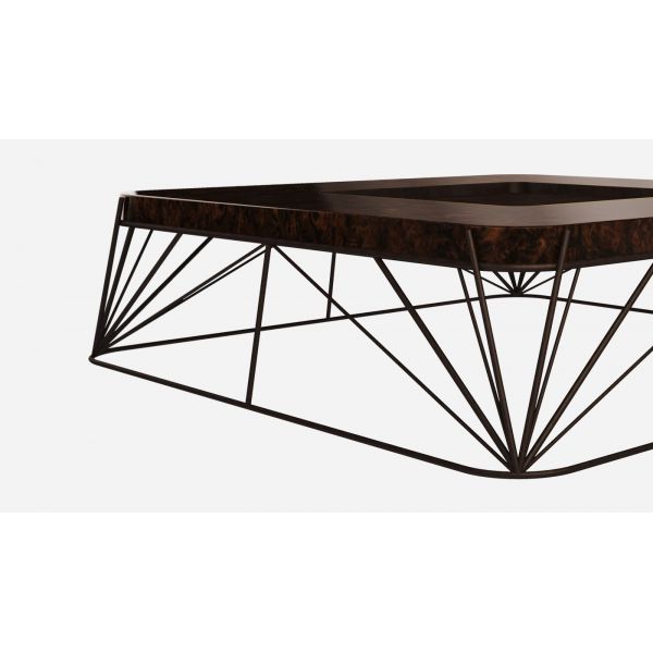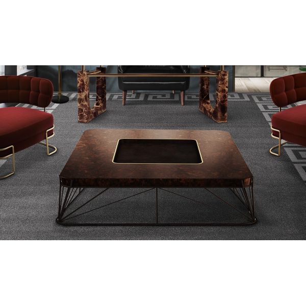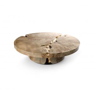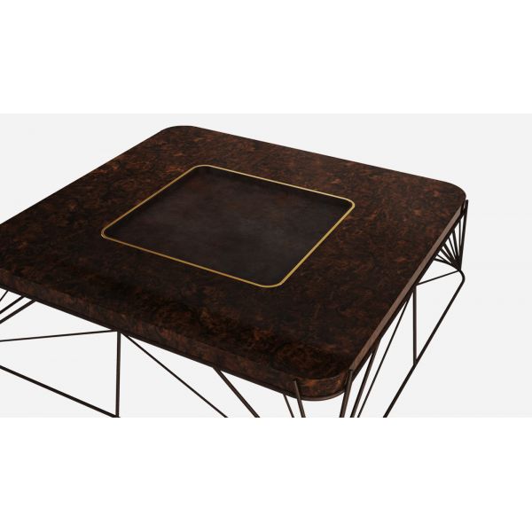 Top: Walnut wood root with high gloss varnish Structure: Brass with Terracotta finish Details: Polished Brass