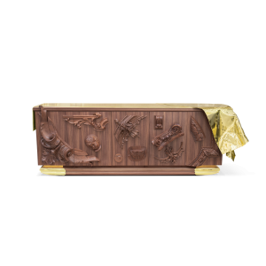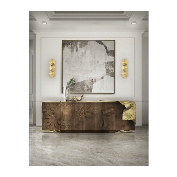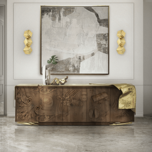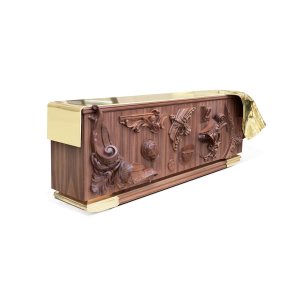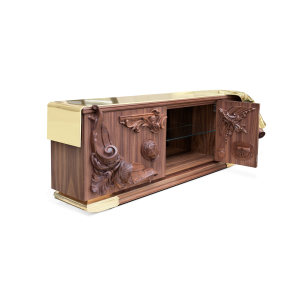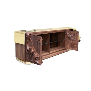 Solid walnut wood, polished brass, bronze mirror and glass.